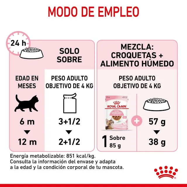 Royal Canin Kitten Sterilised Pouch es un alimento húmedo especialmente formulado para gatitos esterilizados entre los 6 y 12 meses de edad. Tras la esterilización, los gatitos suelen presentar menor actividad y un cambio metabólico que puede favorecer el aumento de peso. Por este motivo, esta fórmula ofrece un nivel moderado de grasa y un equilibrio nutricional que ayuda a mantener un peso saludable sin afectar su crecimiento.