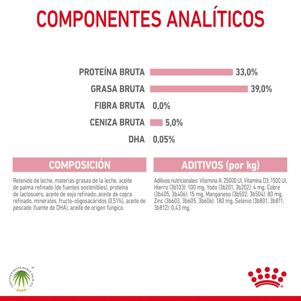 Royal Canin Baby Cat Milk es un alimento completo diseñado específicamente para gatitos desde el nacimiento hasta el destete (0-2 meses). Su formulación busca imitar lo más fielmente posible la leche materna felina, aportando alta energía, proteínas de muy fácil digestión y una mezcla adaptada a las necesidades tempranas del gatito. Royal Canin+1