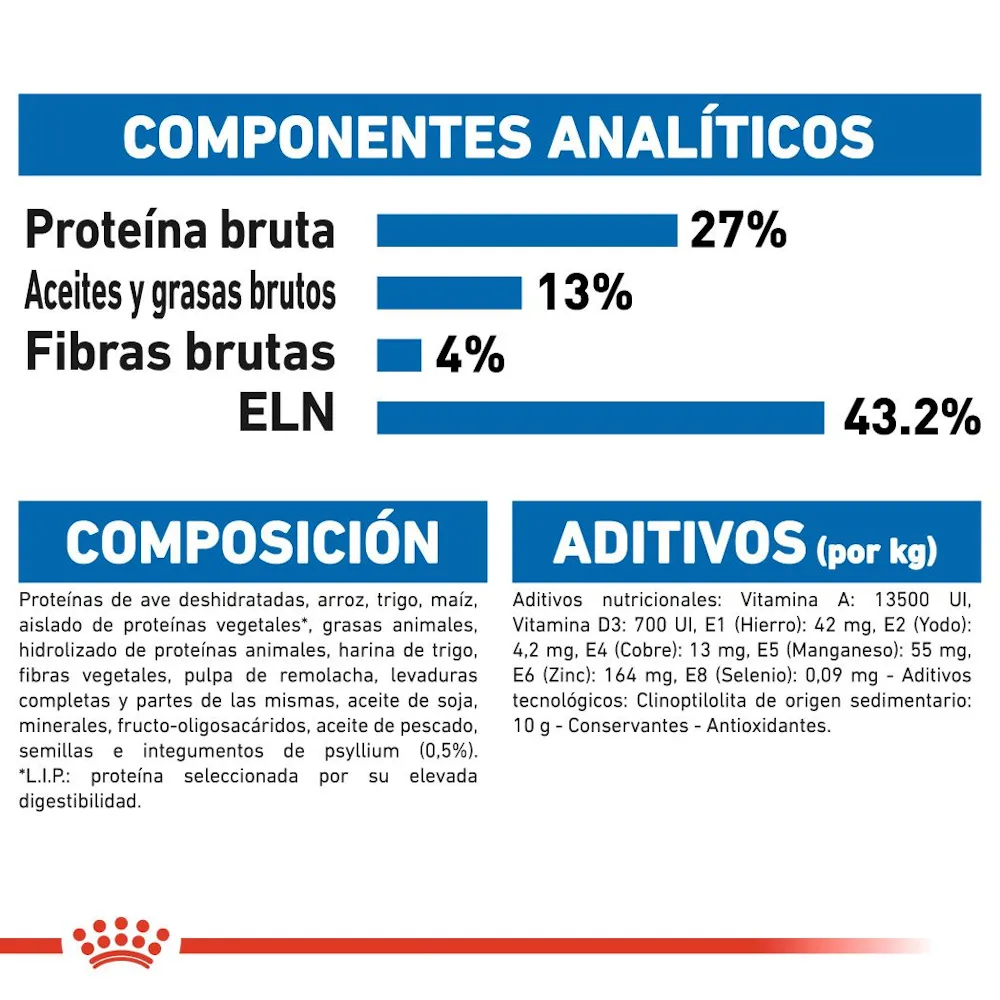 Royal Canin Indoor Feline 1,5 kg es un pienso diseñado específicamente para gatos adultos que pasan la mayor parte de su vida en interiores. La vida en interiores suele implicar menor ejercicio, tránsito intestinal más lento y mayor tendencia a sobrepeso o a heces más olorosas. Esta fórmula aborda esos retos: incluye proteínas de alta digestibilidad (L.I.P.) para ayudar a reducir la cantidad y el olor de las heces, así como una grasa moderada adaptada al estilo de vida menos activo del gato de interior.